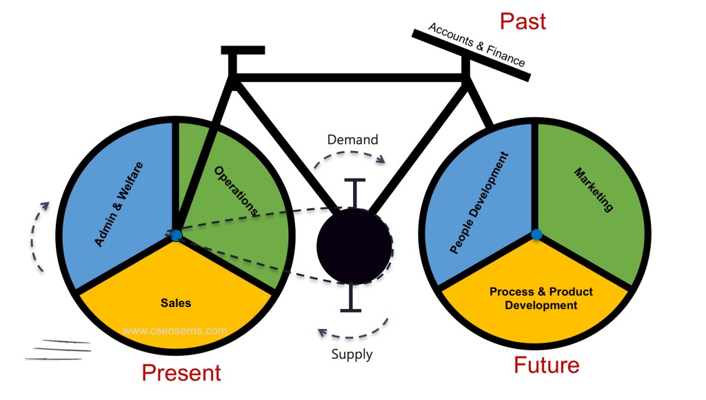 In some cases, you may also see companies that only focus on one wheel β working on marketing and product development and forgetting the operations and sales and vice versa. This is like pedalling the bicycle when one of the wheels tied to a post. Even after exhausting all your energy to pedal, the bike will stay in the same place β the organisation would stagnate.